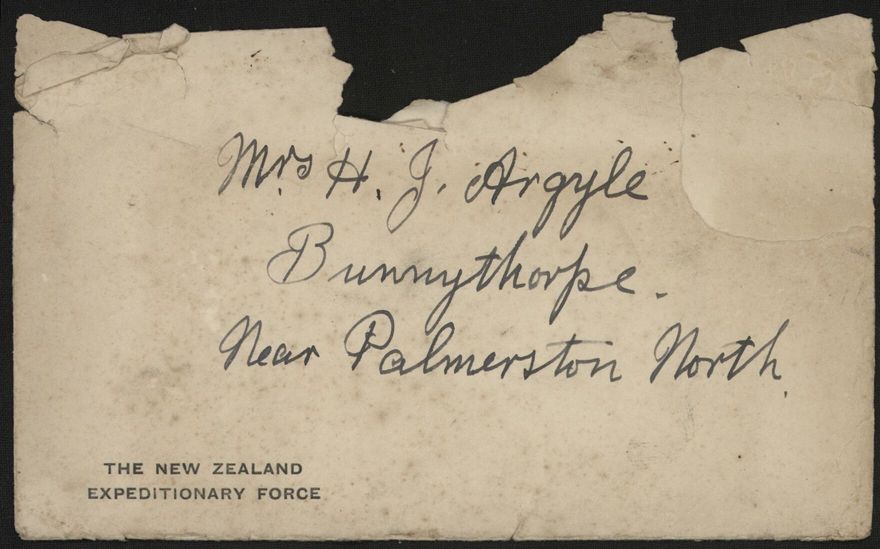 Len Argyle (1894-1915) was one of the sons of Henry and Alice Argyle of Bunnythorpe. He and his brother Pat (Percival) enlisted in the NZ Expeditionary Forces together and served in World War One. This letter from Len to his parents, was sent from Trentham Military Army Camp while they were in training before embarking for Europe.