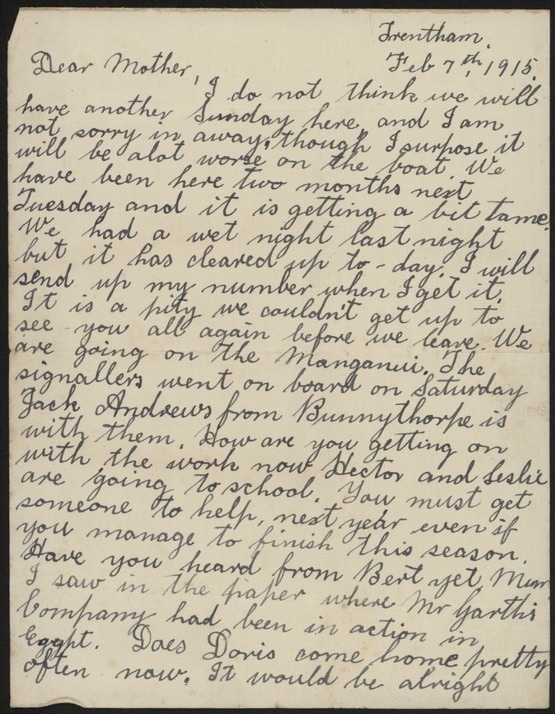 Len Argyle (1894-1915) was one of the sons of Henry and Alice Argyle of Bunnythorpe. He and his brother Pat (Percival) enlisted in the NZ Expeditionary Forces together and served in World War One. This letter from Len to his parents, was sent from Trentham Military Army Camp while they were in training before embarking for Europe.