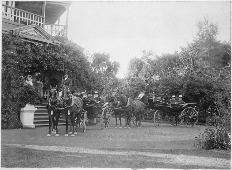 'The Wattles' was built for William Park, a stationer of Palmerston North, and his family in 1887. Richard John Seddon visited Palmerston North when Prime Minister of New Zealand, along with James Carroll, Member of Parliament. In the vehicle on the left: William Park, with bowler hat and moustache; Richard John Seddon, with white beard. In the vehicle on the right is James Carroll, with hand on chin.
