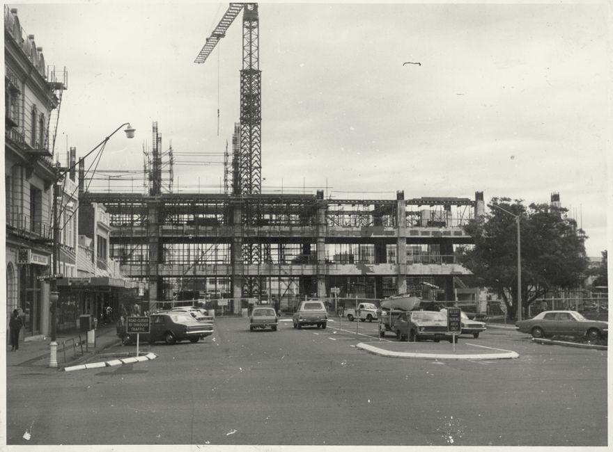 The building of the new Palmerston North City Council administration offices on The Square. This view looks towards the construction from the Church Street corner of The Square.
