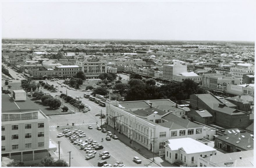 Looking down to the corner of Main Street, with the then Public Library on the left foreground and the then Chief Post Office on right foreground. Shows across one side of The Square to corner of Coleman Place, with the DIC department Store facing.