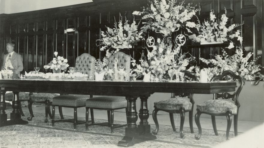 The top table set in readiness for the civic reception for Queen Elizabeth II, held at the C M Ross tearooms. Queen Elizabeth II and Prince Philip visited Palmerston North, as part of their New Zealand tour, 7-8 January 1954. The 'royal table' was constructed by Axel Hansen in his workshop (information from his daughter 2013).
