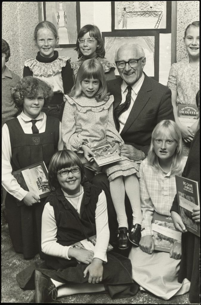 Sir John Marshall is shown here presenting prizes for a short story writing contest in the Palmerston North Children’s Library. The contest was organised by the Public Library as part of New Zealand Book Week. Carolyn Norgate of Whakarongo School sits on Sir John's knee, surrounded by other prize winners.