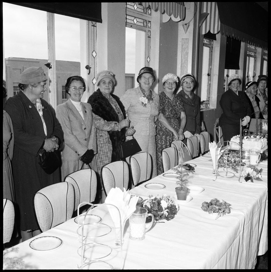This image was taken for a story that ran in The Manawatu Evening Standard on 03 May 1961 "The Manawatu Provincial of the Women's Division of the Federated Farmers celebrated its 33rd birthday at an informal afternoon tea function held a the P.D.C. on Friday. Some of the officials are seen before the function began. They are (from the left): Mesdames E. Magee (Kairanga), E.H. Archer (Sandtoft), O. Jackson (Palmerston North) the provincial vice-president, F.J.T. Poppe (president), H. Oden (secretary-treasurer) and V.B. Short (Feilding) a vice president. Both Mrs. Poppe and Mrs. Oden are members of the Dominion Council."