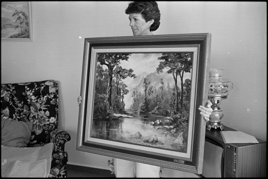 This image was likely taken by the Evening Standard on the 12th of February 1984 but was not published. It depicts a painting by Derrick Way held by his wife Jenny. The painting was presented to former United States president Jimmy Carter and his wife Rosalynn during their visit to Palmerston north.