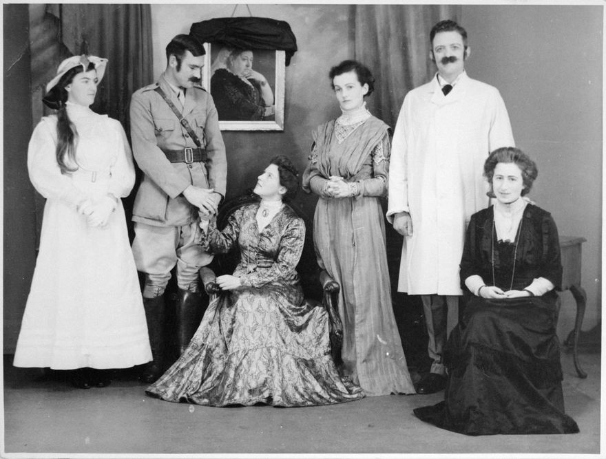 "The Precious Years", by Winton Davis and Leslie Verry, was written for the 60th Jubilee of the city of Palmerston North in November 1937. The play was presented at the Opera House and the script is held at the Palmerston North Public Library. The cast, from left: Millie Penketh (became Mrs Robieson), Amos McKegg, Muriel Richards, Babette Rodgers, Ken Struthers, Elaine Hall.