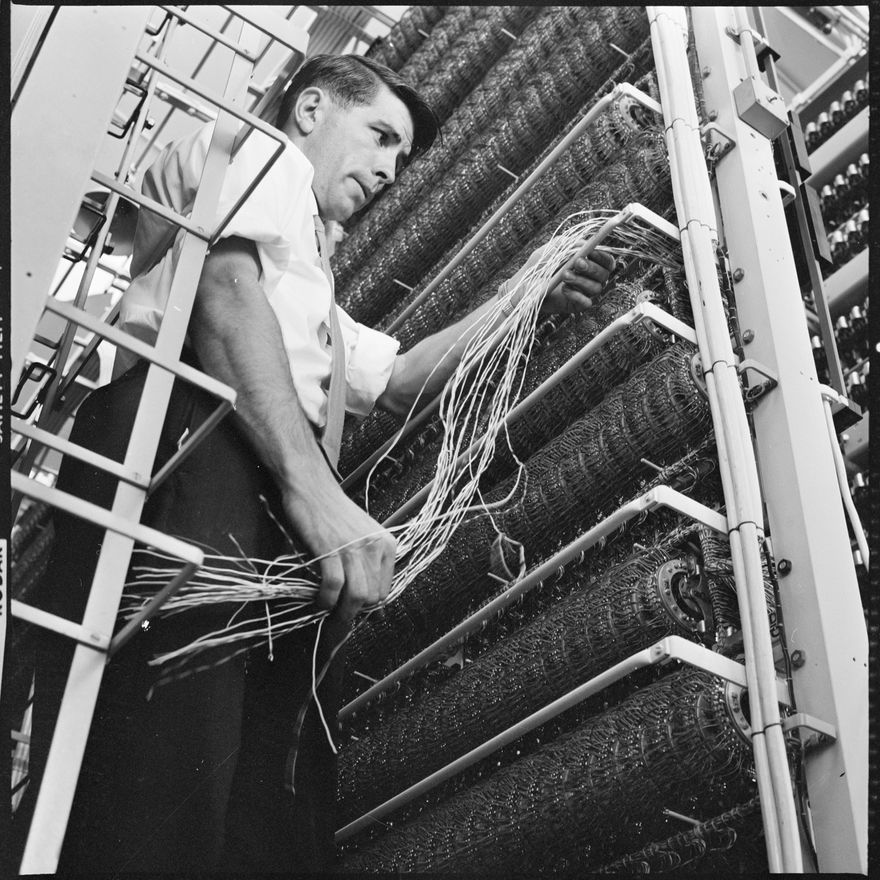 This image was taken for a story that ran in The Manawatu Evening Standard on 19th January 1966 "Mr. B.J. Laurent, a telephone technician at the Palmerston North automatic exchange, works on the 2000-line extension to the installation."