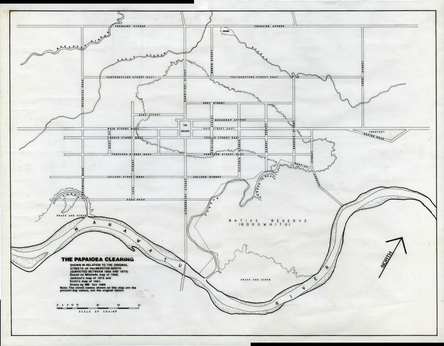 The Papaiōea Clearing shown in relation to original streets of Palmerston North
