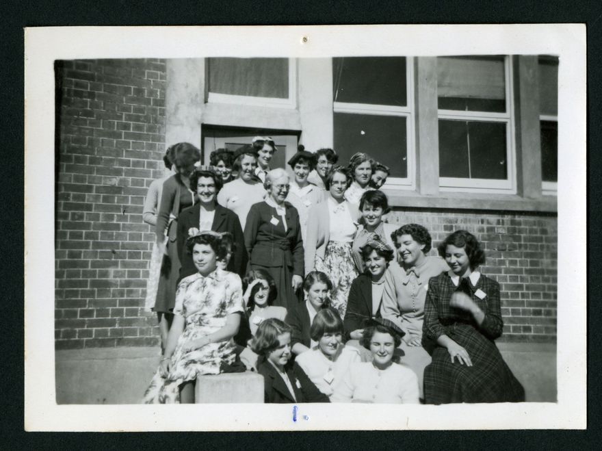 Members from St. Andrew's Presbyterian Bible Class, Palmerston North attending the Girls’ Easter Camp at Marton. From left. Front row: Beth McDowall, Helen (Noppy) Dunlop; Margaret Corkhill. 2nd row: Loraine Salter; Judith Dunlop; Isabel Pilkinton; unknown; Valerie Henderson; Shirley Salter. 3rd row: Beth Thompson; Gwen Moore (Camp leader); Jocelyn Mead; unknown. At back: Unknown; Unknown; Elayne Thompson, Unknown; Margaret Hubbard; Mary Hubbard; Joy McDowell; Jo Port; Margery Dempsey(?)
