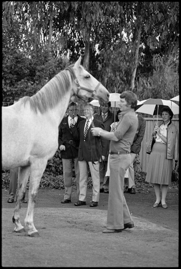 This image was taken by the Evening Standard on the 11th of February 1984 but was not published. It depicts former United States president Jimmy Carter and his wife Rosalynn visiting Highden Park - Herrick and Judy Perry's thoroughbred stud farm at Awahuri.
