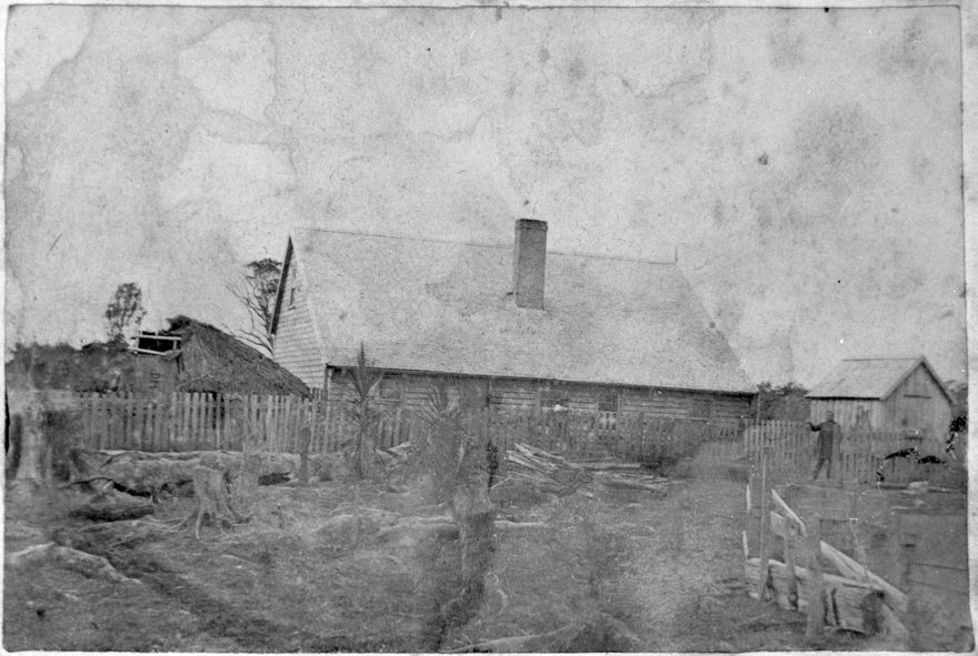 This building was one of the first European houses in inland Manawatu, erected 1867 by European carpenters employed by Ditlev Gothard Monrad, the Lutheran Bishop and ex-Premier of Denmark who settled at Karere in 1866. The house was occupied by the Bishop and his wife 1867 - 1868 and then by one of the Bishop's sons, Viggo, 1868 - 1885. The last owners and occupants were two of Viggo Monrad's sons, Ditlev and Oscar, who lived in the house from about 1886 until its destruction by fire in 1889. The house was situated near the bank of the Karere Lagoon on section 35 of the Karere Block, about three miles west of the present settlement of Longburn, near Palmerston North. To the left can be seen the original clay whare that housed the family until the house was built. A translated description of the clay hut reads, “They took the clay from the bed of the lagoon, which puddled with straw they used for the walls and the floor. The roof was of thatch but this was later replaced with shingles”.