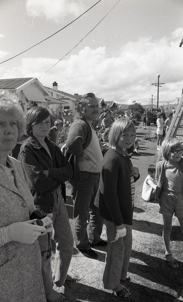 This photograph was taken for a story that ran in the Manawatu Evening Standard on 19 February 1973 with the caption, "It looked like a case of "if Mohammed wouldn't go to the mountain, the mountain ad to go to Mohammed" when St John's Presbyterian Church, Palmerston North, was moved on Saturday. The Church wants to get closer to its parishioners, most of whom are now in the Highbury area, so it was moved by a Whanganui firm from Nikau Street to Brentwood Avenue. City Council staff lifted power and telephone lines along Featherston Street as the 26ft high building moved along. It took about three hours for the church to reach the new site where it will be renovated and extended."