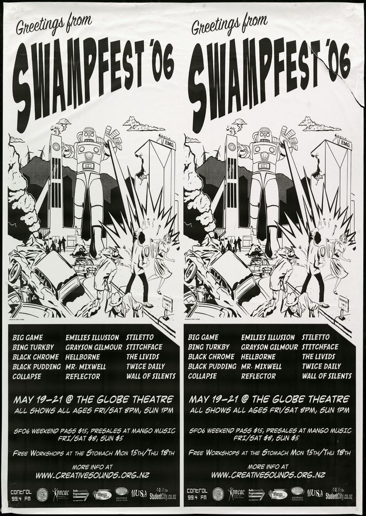 Greetings from Swampfest '06. Big Game, Bing Turkby, Black Chrome, Black Pudding, Collapse, Emilies Illusion, Hellborne, Mr Mixwell, Reflector, Stiletto, Stitchface, The Livids, Twice Daily, Wall of Silents. May 19-21@ The Globe Theatre. All ages all shows Fri/Sat 8pm, Sun 5pm. Part of a collection of posters that were displayed at The Stomach, Lombard Street, venue for Creative Sounds Society Incorporated.