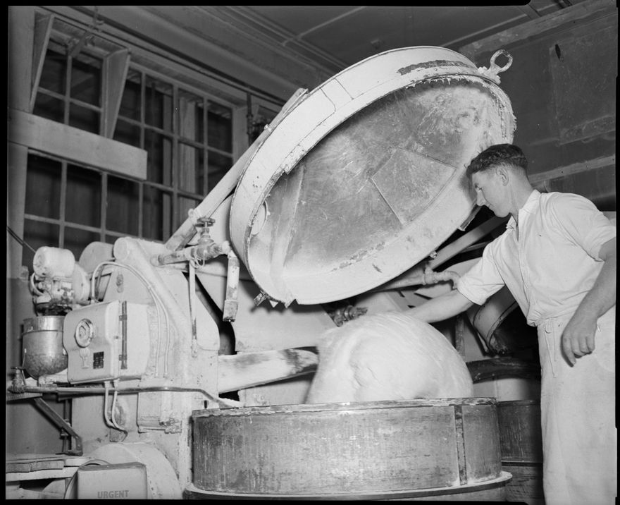 This image was taken for a story that ran in The Manawatu Evening Standard on 19 July 1958, page 13: "On this man's shoulders rests the responsibility of ensuring that the mix which is in the dough-mixing machine is perfectly balanced. Mr. P. Norris has been employed by Boniface Bros. for 18 years and he is a master of his trade and is known in the bakery as the doughman."
