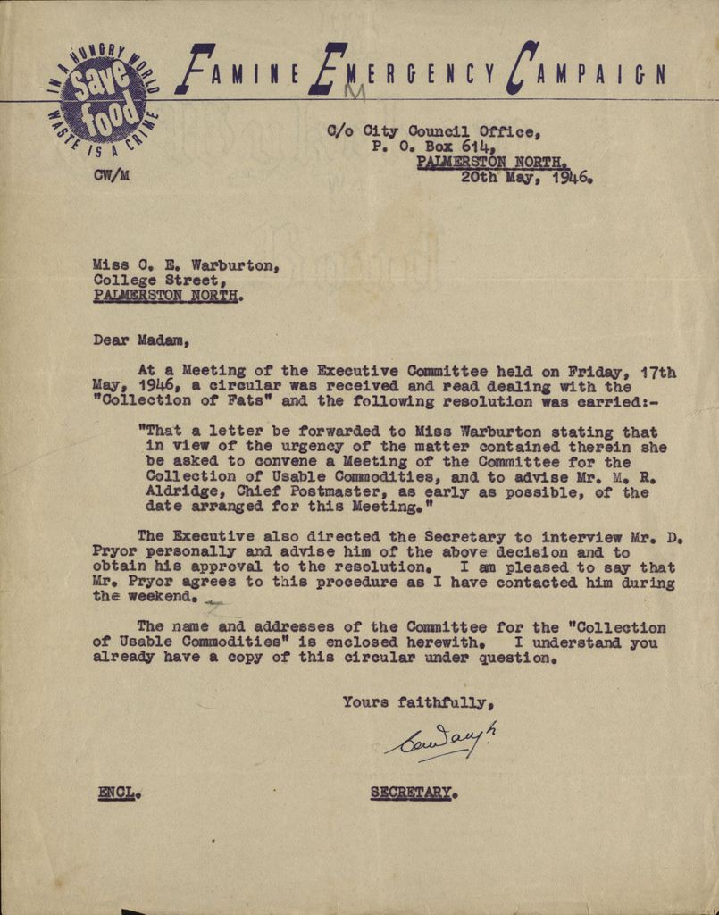 Letter dated 20 May 1946 requesting Miss Warburton convene a meeting for the Committee for the Collection of Usable Commodities