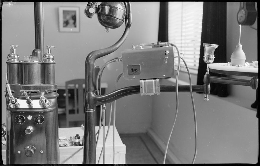 This image was taken for a story that ran in The Manawatu Evening Standard on 25 March 1958, page 6: "A city dentist acquired this machine, the first in Palmerston North, and capable of high-speed drilling of up to 300,000 revolutions a minute. The unit is 9 in. long and works on a turbine principle."