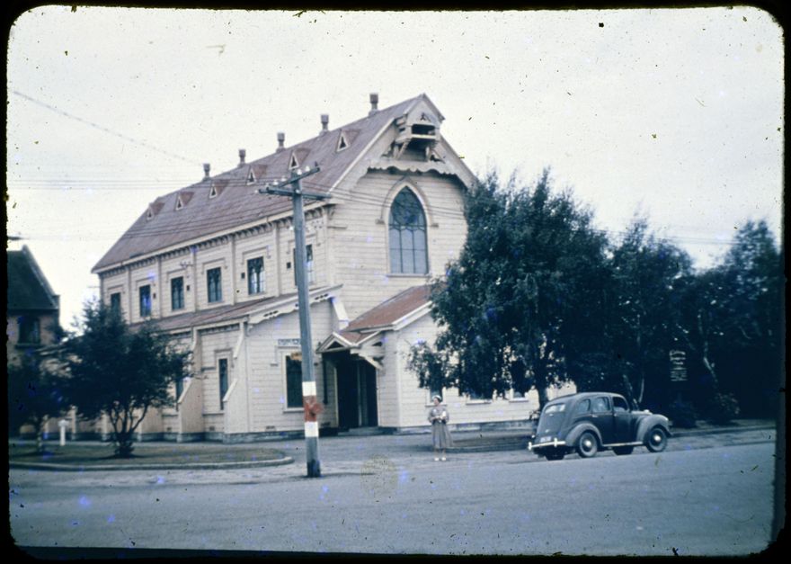 The building shown here was the second Presbyterian Church in Palmerston North, built in 1893 for the Rev. William Thomson and his congregation, to replace the 1878 structure. This building was in turn replaced by the present building, completed in 1957.
