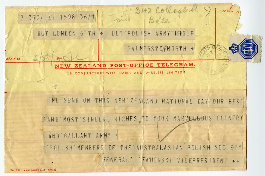 Telegram to the Polish Army League. "We send to this New Zealand National Day our best and most sincere wishes to your marvellous country and gallant army. Polish members of the Australasian Polish Society. General Zahorski Vice President." Polish Army League, founded in Palmerston North in WWII, corresponded with and sent parcels to Polish soldiers who served with the allies in World War Two.