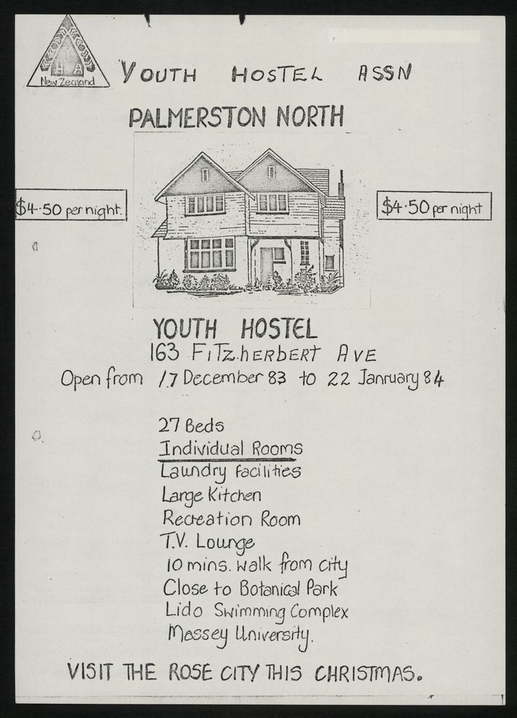 "Youth Hostel Assn Palmerston North. $4.50 per night. Youth Hostel, 163 Fitzherbert Ave. Open from 17 December 83 to 22 January 84. 27 beds. Individual Rooms. Laundry Facilities, Large Kitchen, Recreation Room. T.V. Lounge. 10 mins walk from city. Close to Botanical Park. Lido Swimming Complex. Massey Univrsity. Visit the Rose City this Christmas". Part of a collection of posters that were displayed in the Public Library in the 1970s - 1980s.