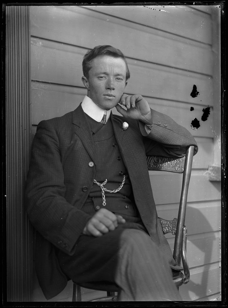 This photograph was created by William James Young in the early 20th century. A large variety of subjects are depicted in the collection, but family, rural life and travel are the most prominent themes. The exact location of the photographs in the Young Collection is unknown, but W J Young lived on a farm in Mt Stewart, Rangitikei, and some of the photographs include his house. The Young family were apparently avid travellers and photographs later in the collection feature scenes from Rotorua, Auckland, Whanganui, as well as other unidentified locations. The portraits are all unidentified, but are presumably of members of the Young family. The photographers parents were George Henry (b 1833) and Jane McDowell (b 1842, d 1916). They came to New Zealand in 1877. The same year, they bought the home farm on Mt Stewart and called it Kilrudden after Kilrudden House, the home of the McDowell family in Ireland. The couple had four children: Ann (b 1873), Margaret (b 1876), John (b 1878) and William James (b 1880). William James married Mary Elizabeth Thompson and they had four children: Doris (b 1914, d 1989), George (b 1916, d 1991), Royden McDowell (b 1925, d 1992) and Noel William (b 1927, d 2013).