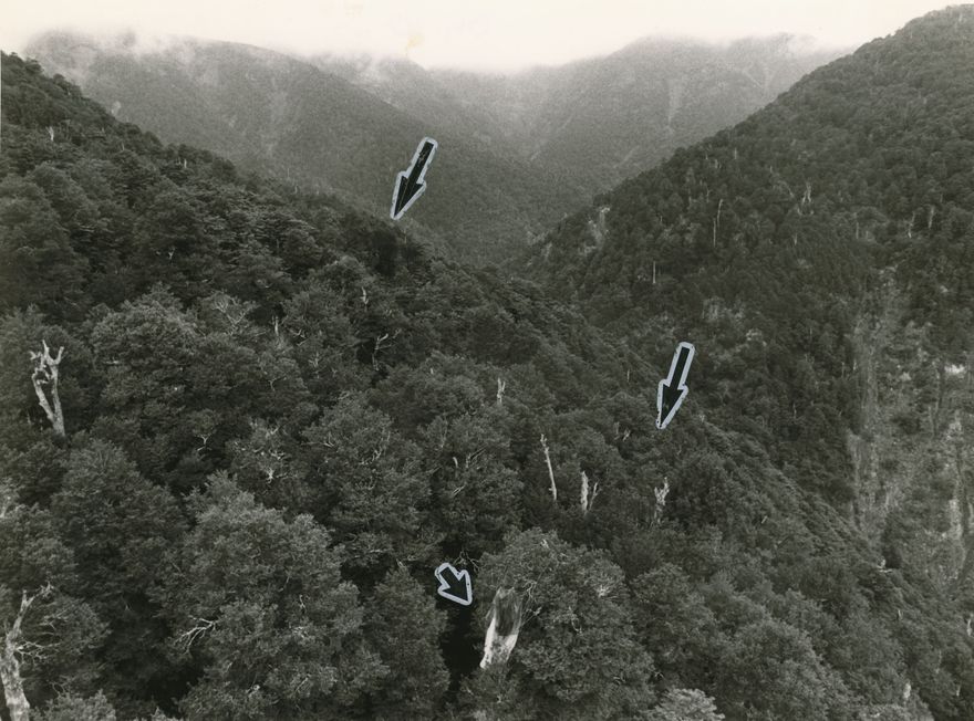 The Skyhawk, piloted by Flight Lieutenant John Nicholas Dick, was on a routine exercise in the Colenso area of the Ruahine Ranges when it crashed on 25 March 1981. Flight Lieutenant Dick was killed in the crash. This photograph shows the location of the crash. The top arrow shows the point of impact, the centre arrow shows where the engine was found and the bottom arrow shows the parachute canopy.