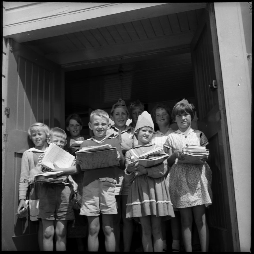 This image was taken for a story that ran in The Manawatu Evening Standard on 16th March, 1963. "Pupils of the Carnavon Primary School had their last lesson at the school yesterday as the Wanganui Education Board has closed it down. In the top photograph pupils of the school gather their books, pads and pencil cases together in preparation for shifting to their new schools on Monday- either Rongotea or Glen Oroua. The bottom photograph shows the children with smiles of satisfaction on their faces after their party lunch yesterday. This was arranged by their parents to commemorate the closing down of the school. In the background is the chairman of the school committee (Mr A. S. Pedley, left) and the sole teacher of the school (Mr G. O'Neill)- (bottom photograph not included in negatives)."
