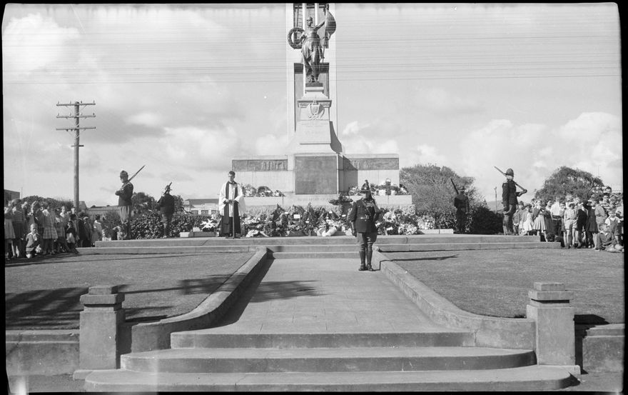 This image was taken for a story that ran in The Manawatu Evening Standard on 27 April, 1959. "The Rev. C. F. Browne is here seen officiating at the mid-morning Anzac service held at the Palmerston North Cenotaph. The guardsmen have been selected from the Legion of Frontiersmen. About 300 former servicemen attended the service."