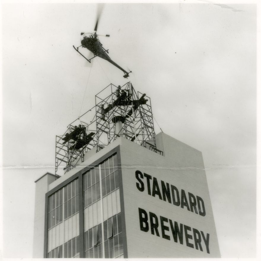 A helicopter flies the framing for the sign ontop of the Standard Brewery building in December 1964. The brewery was located on the corner of Elizabeth and Featherston Streets. The facility was later operated as a branch of Lion Breweries until its closure in September 1985. The building was demolished in 1992. These photographs were later laminated, resulting in fuzziness and visible creases in some of the images.