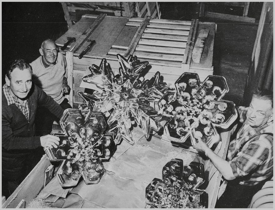 The Palmerston North City Council bought some of the decorative lights originally displayed in Regent Street, London, for display during Palmerston North's centennial. Here, PNCC workmen unpack the lights.