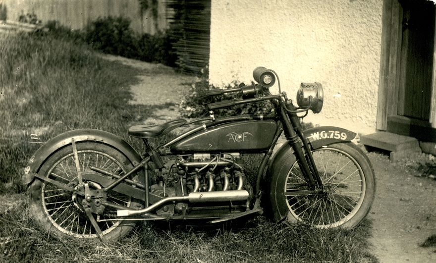 The ACE c1922 4 cyclinder motorbike with gas lighting, registration WG759, was owned by Ernest Davis, shown parked outside his parents home at 171 Albert Street. Ernie was the son of James and Harriet Davis, who farmed at Fitzherbert West before moving into Palmerston North c1910. the bike was reported to need a running start to get it going.