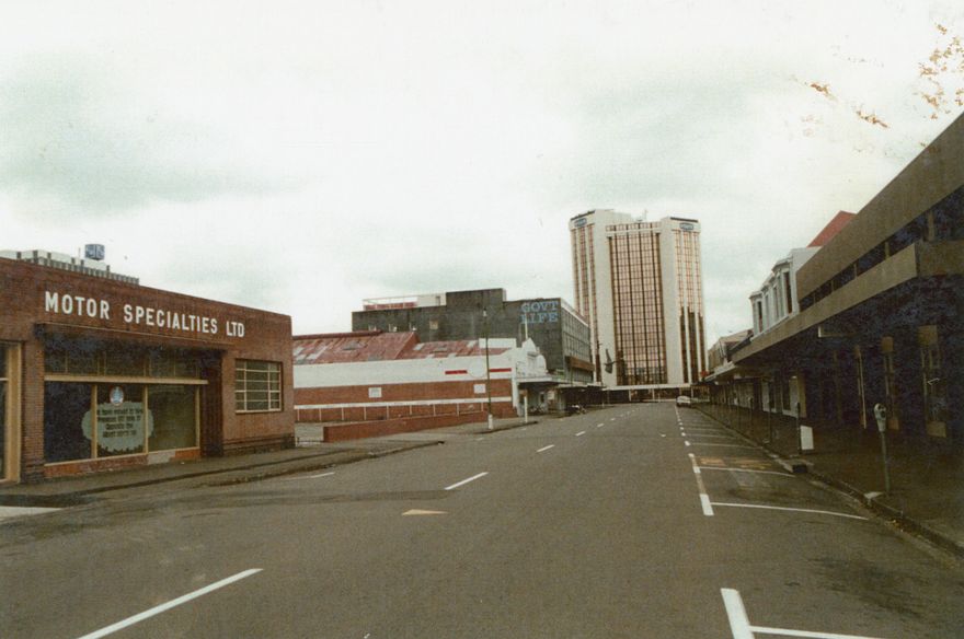 A view looking down Queen Street towards the State Insurance Building on Rangitikei Street