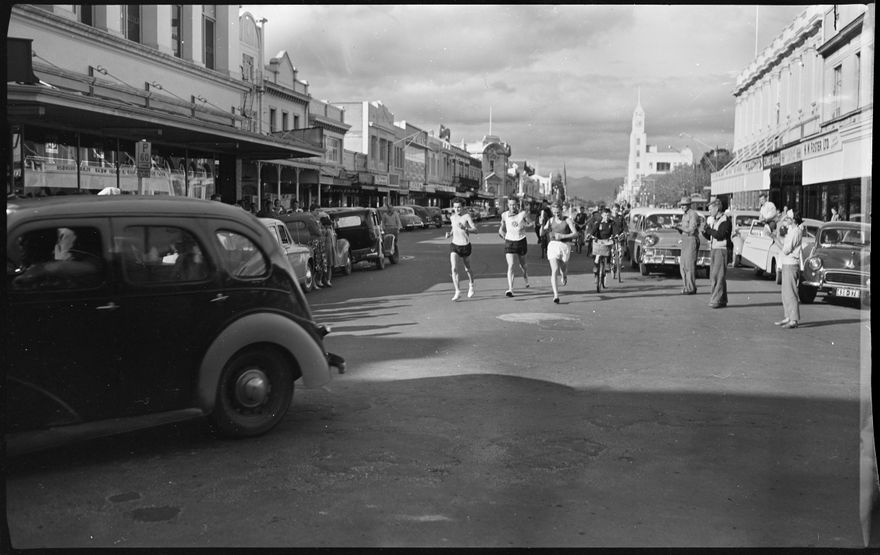 This image was taken for a story that ran in The Manawatu Evening Standard on 13 October, 1959. "Seen running down Coleman Place after a 100-mile run from Wellington on Saturday are the three men who carried a message from station 2ZB congratulating the Palmerston North station on the celebration of its 21st birthday. The runners (from left) are: P. Richards, L. Sykes and, holding the scroll, J. Lucas."