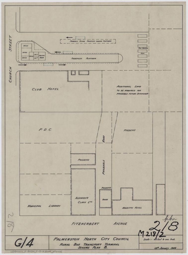 Plan of the bus station for rural buses, in relation to Church Street and Fitzherbert Avenue.