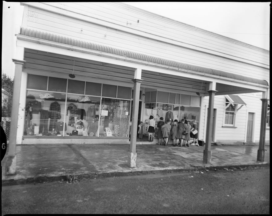 [Photograph of the street view and store front of Arthurs Modern Drapery with children gathered, looking in the window.]