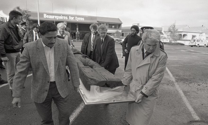 This image was taken (but not used) for a story that ran in The Manawatu Evening Standard on 4th August 1993. "The air was thick with emotion when four Rangitāne pouwhenua (carved stockade posts) were returned home yesterday after an absence of 60 years. Originally from Puketotara Pa, the pouwhenua were considered significant and important taonga for the Rangitāne people. They were the only large Rangitāne carvings still in New Zealand, and four of seven in existence. In 1933, Wiremu Kingi Te Awe Awe presented the carvings to the then Dominion Museum for safekeeping. There they were displayed in the Māori Hall for many years. Today, a delegation from the Museum of New Zealand, Te Papa Tongarewa, led by board chairman Sir Hamish Hay and Māori art and history director Cliff Whiting, handed over the carvings on a permanent loan basis to the Manawatu Museum. They will form a major component of the exhibitions in the new Manawatu Museum - Science Centre, opening in February next year. Mr. Whiting said the decision to return the carvings to their area of origin was part of the New Zealand Museum's policy of partnership with other museums. [Pictured] One of the four Rangitāne pouwhenua, returned to the Manawatu yesterday, is unveiled in preparation for transportation to a wing of the Museum's new premises."