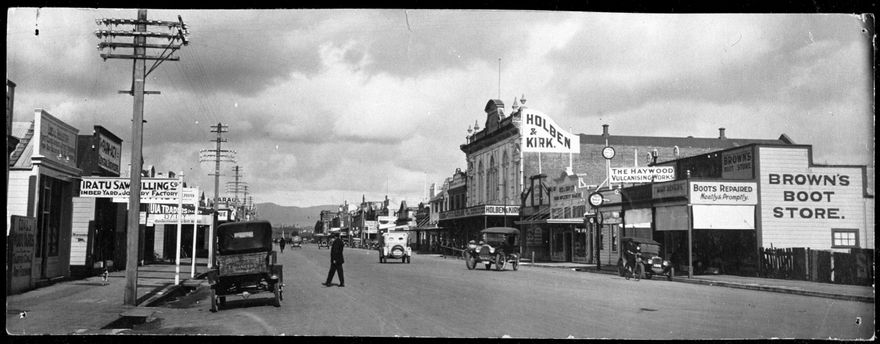 This photograph was taken from the corner of Featherston Street looking down Rangitikei Street towards The Square. It shows a busy street scene, complete with pedestrians, traffic and parked cars. Visible on the right side of the street are Brown's Boot Store, Haywood's Vulcanising Works, Red and Gray Ltd - Farm Implement Makers, unknown and Holben and Kirk. Visible on the left side of the street are the Tiratu Sawmilling Company and Huia Traders (Dairy, Confectioners and Soft drinks).