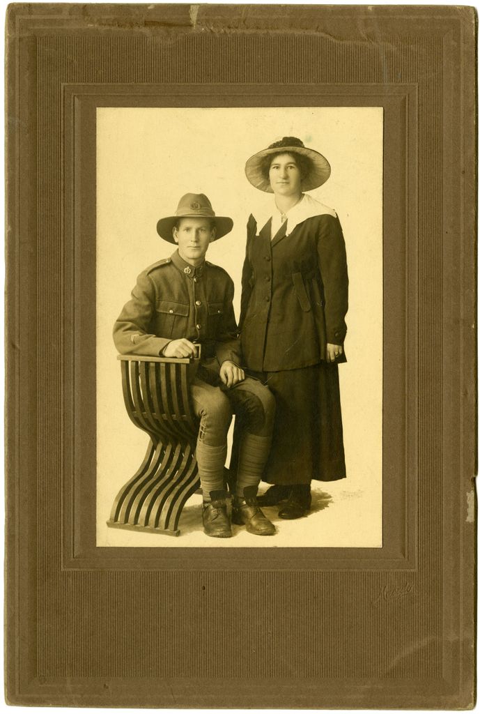 Gilbert Edison Rose with wife Mary Constance Cecile Hinkley (m. 1916). Gilbert Rose's parents were early settlers to the Rangiwahia district. Gilbert served with the 27th New Zealand Mounted Rifles during World War One. His military service began on 28 October 1916 and ended 17 June 1919. After training at Featherston Camp, he spent 1917-1918 as part of the Egyptian Expeditionary Force. He caught malaria in 1918 and was hospitalised in Cairo - he was not discharged until January 1919. He died in Feilding in 1945, officially as a result of his earlier malarial infection, and is buried in Rangiwahia cemetery along with his family. These photographs are held with the Rose Papers in the Ian Matheson City Archives.