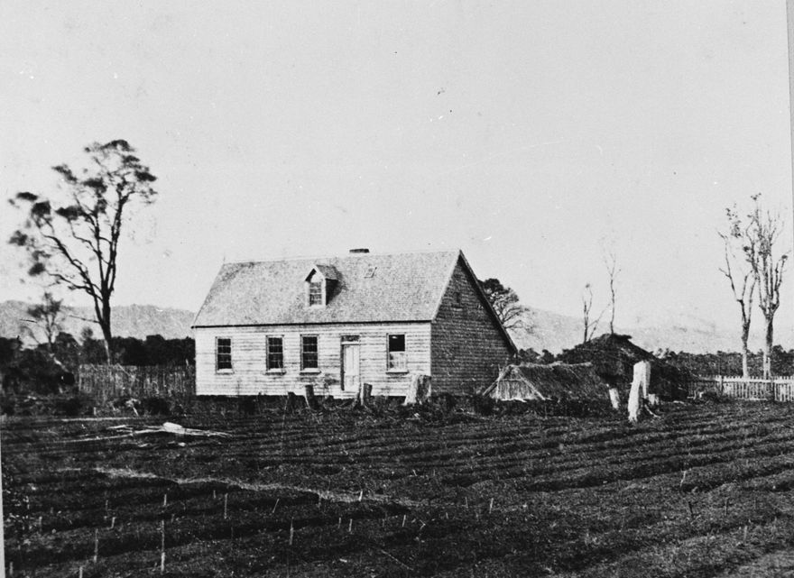 This building was one of the first European houses in inland Manawatu, erected 1867 by European carpenters employed by Ditlev Gothard Monrad, the Lutheran Bishop and ex-Premier of Denmark who settled at Karere in 1866. To the right of the house can be seen a clay and thatch whare, which may be the hut occupied by the Monrad family prior to construction of the house. The house was occupied by the Bishop and his wife 1867 - 1868 and then by one of the Bishop's sons, Viggo, 1868 - 1885. A verandah and extra ground-floor rooms were added to the house about 1880. The last owners and occupants were two of Viggo Monrad's sons, Ditlev and Oscar, who lived in the house from about 1886 until its destruction by fire in 1889. The house was situated near the bank of the Karere Lagoon on section 35 of the Karere Block, about three miles west of the present settlement of Longburn, near Palmerston North. Though the photographer is unknown, he was possibly a young Dane named Bloch who came to New Zealand with the Monrads, and was known to take photographs when he visited Karere 1867.
