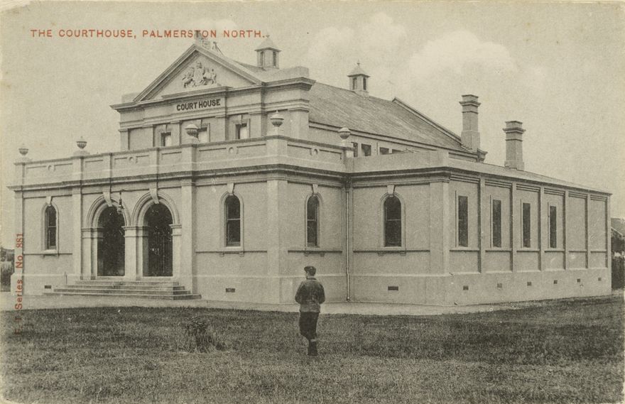 This was the fourth Palmerston North Court House. The first Court House was constructed in 1874, and replaced in 1881. In 1895 a third Court House was built and the second one moved to Church Street for use as the Police Station. The third building was short lived as it burnt down in 1897. This (fourth)Court House remained in use, with additions and alterations, until it was demolished and replaced by a new one, completed in 1988.