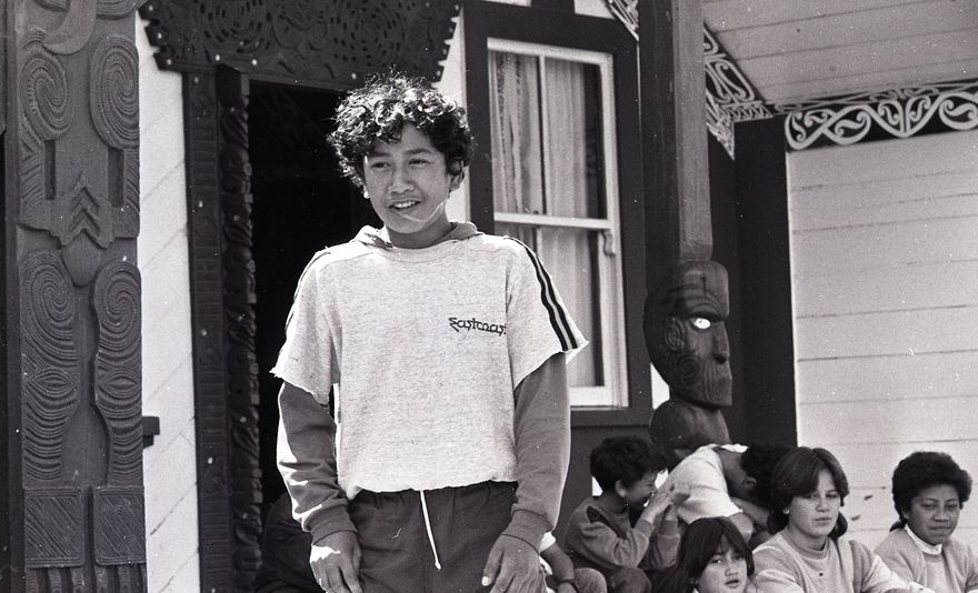 This photograph was taken for a story that ran in the Manawatu Evening Standard on 29 October 1985 about an extended visit made by Highbury residents to the Kauwhata Marae (Feilding). The families spent the week at the marae for an educational programme aimed at connecting them with their heritage, including lessons in te reo and learning about taha wairua (spiritual health). The people in the photograph are unidentified. To read the whole story, see Manawatu Evening Standard 29 October 1985.