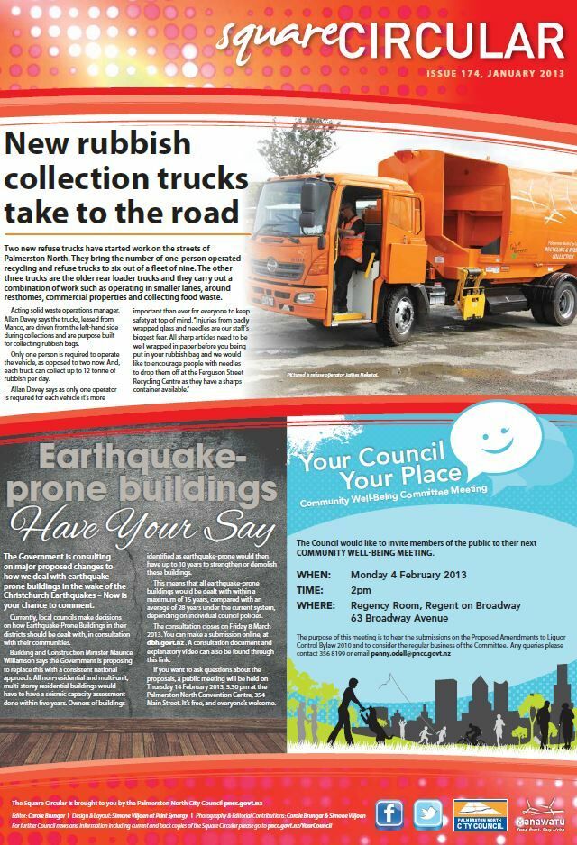The Square Circular was Palmerston North City Council's monthly community publication, informing Palmerstonians of PNCC initiatives, activites, and events. This month's issue includes: Recycling; Earthquake Prone Buildings; WOF and Rego; Parking; Te Pātikitiki Library; Heritage; Globe Fundraising; Permaculture Design Course; Waitangi day: Te Manawa; Sustainability; Civil Defence; Esplanade Day.