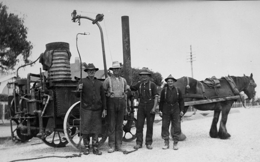 - This horse drawn tar heater, working in Ward Street, Palmerston North, was owned by the Palmerston North City Council. From left: Charlie Stevens - sprayer; August Wroblenski; George Franklin; Tom Buckley