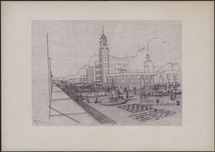 Plans for the development of the central area around The Square of Palmerston North. It includes proposals for the use of public spaces around Coleman Mall, Broadway Avenue and Church Street.