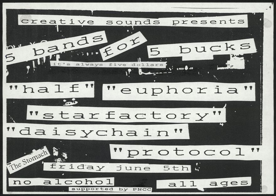 Creative Sounds presents 5 bands for 5 bucks. It's always 5 dollars. "half", "euphoria", "starfactory", "daisychain", "protocol". The Stomach. Friday June 5th. No alcohol. Supported by PNCC. All ages.