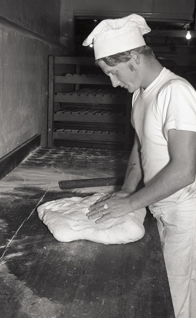 Caption: "The Manufacture of Bread - An Essential Food. The bread we eat each day is one of the many things we take for granted and Photorama on these three pages shows the process needed in the manufacture of bread. Bridewell Bakery Palmerston North and Levin is one of five bakers in this area who bake every night five nights a week producing our daily bread. This firm with a staff of 17 in Palmerston North and 11 in Levin turn out well over two million loafs of bread a year."