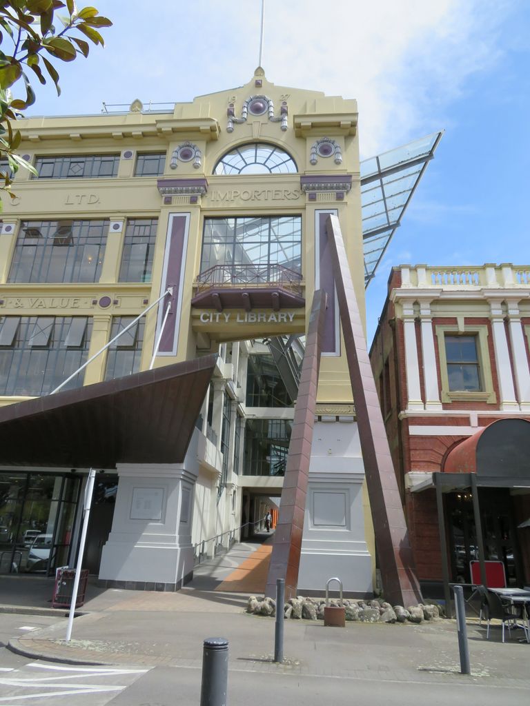This entrance to the City Library is on The Square. The ramp leads up to the main doors into the library on the Mezzanine Floor. The library was opened in 1996, after the conversion of a former department store in a library. It was first built by the C M Ross Co. Ltd (Roscos) in 1927 to 1928. Athfield Architects were the architects for the library renovation.