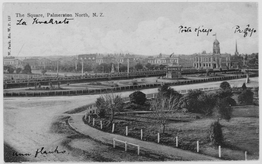 Built in 1906, the Post Office on the corner of The Square and Main Street was Palmerston North’s fourth. Due to the risks in an earthquake, the clock tower was removed in 1942. They were re-purposed for the Hopwood Clock Tower. In 1988, when Telecom and Postbank became separate entities, the building ceased to be the Post Office. It currently operates as a restaurant and bar. The rotunda in the centre right of the postcard is the original structure - it was moved to the Victoria Esplanade in 1907 to make way for a larger structure. Behind the rotunda is the train line that ran through the Square until after the Milson Deviation was completed in 1959. In 1964 the last passenger train ran through the Square and the tracks were removed. The spire on the far right is that of the Catholic Church, situated in Broad Street.