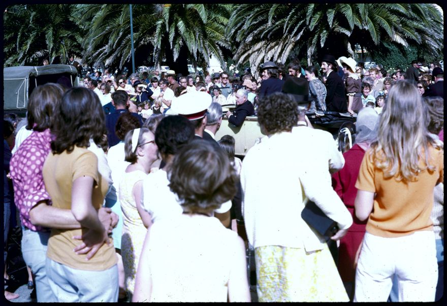 Sir Keith Holyoake, Prime Minister of New Zealand 1957 and 1960-1972, is pictured driving through The Square at the 1971 celebrations. 92 floats took part in the Palmerston North City Centennial celebrations of 1971. Approx. 10,000 people were present at the event to celebrate 100 years of Palmerston North.
