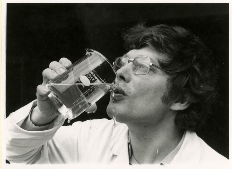 Steve Andrewes, deputy City Council chemist toasts Palmerston North's $5-50 a litre export quality water [1982].