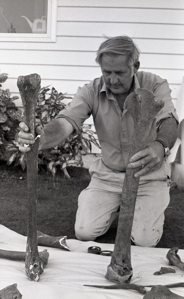 This series of images were taken for a story that ran in The Manawatu Evening Standard on 29 April, 1982. “A well-preserved set of moa bones found on a Levin farm this week will have to be identified by an expert. The bones – a foot and a leg from a large bird and bones from a smaller bird – were found during clearing of a drain 1.5 metres deep on Mr Collis Blake’s farm at Ihakara, north of Levin. R Lou Gurr (left), a former reader in zoology at Massey University, said the large bones definitely came from the “big moa” but the species still had to be identified. He said the bird could have been as tall as 3.5 metres. Mr Blake’s grandfather found a similar set of bones in 1916 in Wairarapa.”